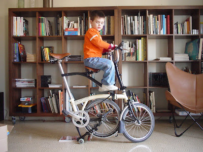 Cykeln blir nästan lika liten i hopfällt läge med barnstolen på. Den verkar ”följa med” och integreras i hopfällningen.